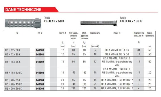 Tulejki siatkowe, pręty gwintowane oraz tuleje z gwintem wewnętrznym nadają się do stosowania z zaprawami FIS V, FIS VS, FIS VW, FIS VT oraz FIS P w materiałach murowanych.