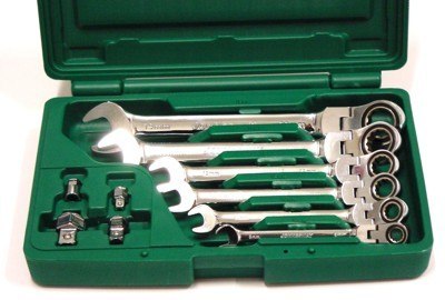 Zestaw kluczy płasko oczkowych z grzechotką i przegubem z adapterami 10 szt