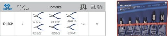 Zestaw 6 szczypiec do pierścieni Segera firmy King Tony. W zestawie znajdują się szczypce do pierścieni wewnętrznych: proste długości 180mm oraz 250mm i wygięte długości 170mm, a także szczypce do pierścieni zewnętrznych: proste o długości 180mm oraz 250mm i wygięte o długości 170mm
