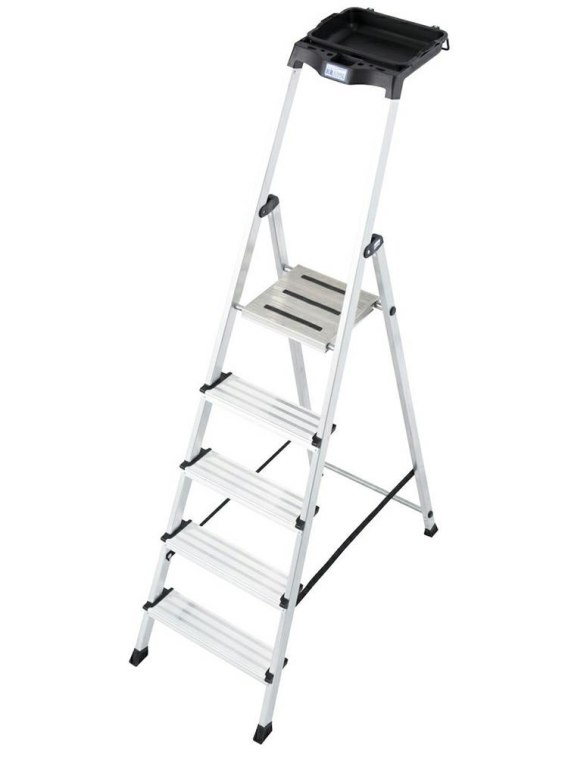 Praktyczna i wszechstronna wolnostojąca drabina z platformą, ze specjalnym uchwytem na wiadro i ergonomiczną, obszerną półką na narzędzia.
