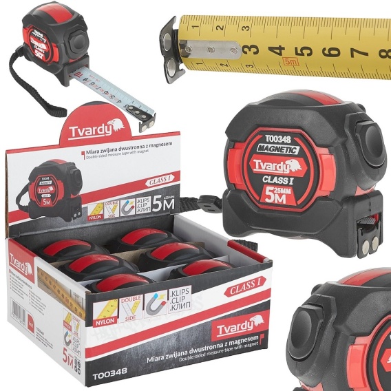 Miara zwijana nylon dwustronna z magnesem i autostopem 5m/25mm KLASA I - kartonik wystawowy (6/60)