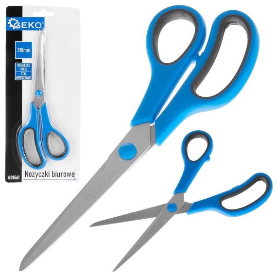 Nożyczki biurowe wykonane ze stali nierdzewnej 2Cr13. Długość całkowita wynosi 210 mm, grubość ostrzy nożyczek to 1,8mm.