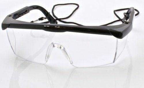Okulary ochronne bezbarwne, wykonane z najwyższej jakości poliwęglanu w I klasie optycznej, wyposażone w czarny sznurek.