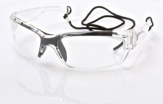 Okulary ochronne bezbarwne, wykonane z najwyższej jakości poliwęglanu w I klasie optycznej, wyposażone w czarny sznurek.