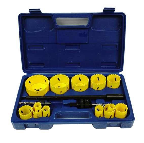 Zestaw bimetalowych otwornic umieszczonych w plastikowej walizce.
