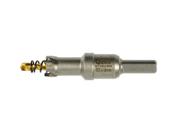 Otwornica TCT do metalu w rozmiarze 16mm. Ostrza wykonane z węglików spiekanych, które charakteryzują się znacznie większą twardością oraz odpornością na wysokie temperatury w porównaniu do stali szybkotnącej HSS. Przeznaczona do wykonywania większej średnicy otworów w stali, żeliwie, metalach kolorowych, drewnie, tworzywach sztucznych itp. Dla zwiększenia precyzji cięcia zastosowano wiertło prowadzące ze stali HSS. Sprężyna zamocowana na wiertle prowadzącym, pozwala w łatwy sposób usunąć urobek.