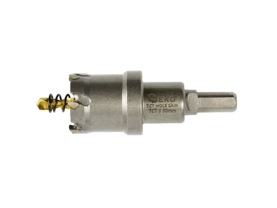 Otwornica TCT do metalu w rozmiarze 30mm. Ostrza wykonane z węglików spiekanych, które charakteryzują się znacznie większą twardością oraz odpornością na wysokie temperatury w porównaniu do stali szybkotnącej HSS. Przeznaczona do wykonywania większej średnicy otworów w stali, żeliwie, metalach kolorowych, drewnie, tworzywach sztucznych itp. Dla zwiększenia precyzji cięcia zastosowano wiertło prowadzące ze stali HSS. Sprężyna zamocowana na wiertle prowadzącym, pozwala w łatwy sposób usunąć urobek.
