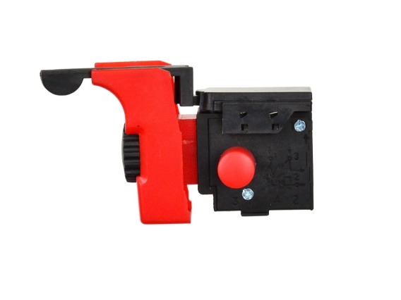 Przełącznik wciskany, z regulacją prędkości obrotowej, zmianą kierunku obrotów prawo/lewo oraz blokadą przełącznika w pozycji włączonej na stałe.