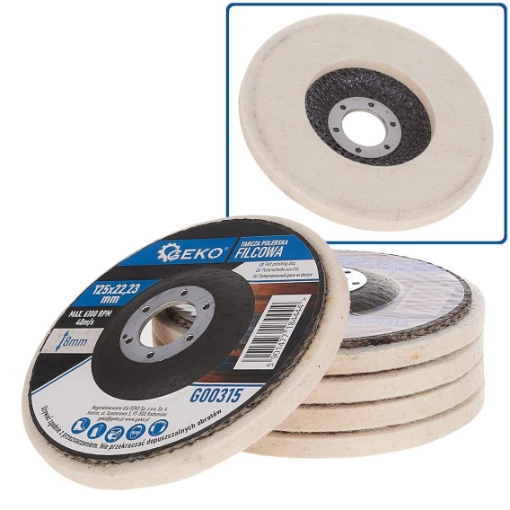 Tarcza filcowa pełna o średnicy 125 mm przeznaczona do polerowania z użyciem past polerskich. Doskonale sprawdzi się w warsztatach ślusarskich, spawalniczych, samochodowych itp., podczas pracy z materiałami takimi jak: metale kolorowe, stal, stal kwasoodporna, aluminium.