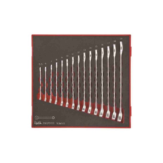 Zestaw 15 kluczy płasko-oczkowych ze stali chromowo-wanadowej. Ten sam rozmiar na obu końcach. Główka pierścieniowa dwunastokątna, odgięta pod kątem 15°. Główki szlifowane. Chromowane. Dostarczany w pojemniku z tworzywa sztucznego z odłączaną pokrywą. Klucze umieszczone są we wkładzie gąbkowym EVA posiadającym trzy warstwy o różnych barwach. Pojemniki pasują do skrzynek i wózków narzędziowych Teng Tools.