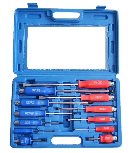 Zestaw dwunastu wkrętaków do pobijania firmy SILVER. Wykonane ze stali CrV, posiadają magnetyczne końcówki oraz dwumateriałową rękojeść. Zestaw przydatny zarówno profesjonalistom, jak i amatorom. Komplet umieszczony w plastikowej walizce.