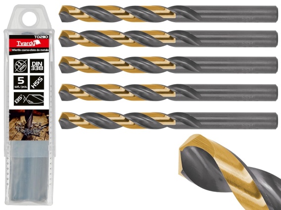 Wiertła do metalu złoto-czarne wykonane ze stali szybkotnącej 4341 HSS, pokryte powłoką TiN (azotek tytanu). Wiertła zgodne z normą DIN 338. Uchwyt cylindryczny.