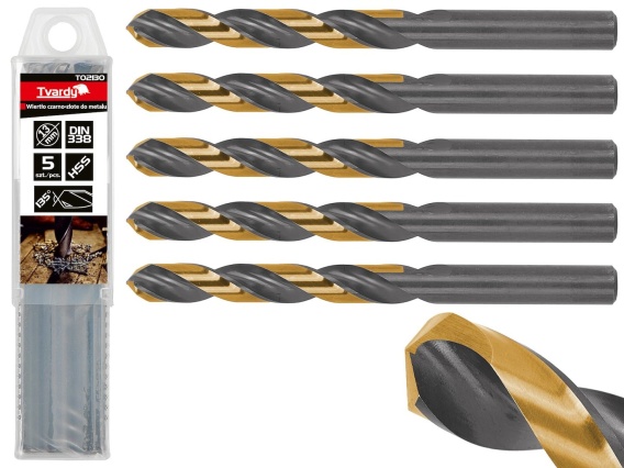 Wiertła do metalu złoto-czarne wykonane ze stali szybkotnącej 4341 HSS, pokryte powłoką TiN (azotek tytanu). Wiertła zgodne z normą DIN 338. Uchwyt cylindryczny.