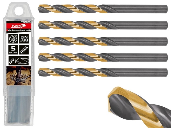 Wiertła do metalu złoto-czarne wykonane ze stali szybkotnącej 4341 HSS, pokryte powłoką TiN (azotek tytanu). Wiertła zgodne z normą DIN 338. Uchwyt cylindryczny.