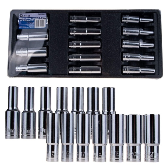 • 14x Nasadki długie 6-kątne (Dł.=68mm): 8, 9, 10, 11, 12, 13, 14, 15, 16, 17, 18, 19, 20, 21 mm