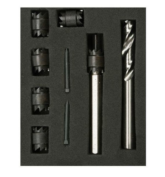 Zawiera 6 dwustronnych frezów koronkowych, uchwyt mocujący, 3 trzpienie ustalające oraz specjalne wiertło HSS 8 mm.