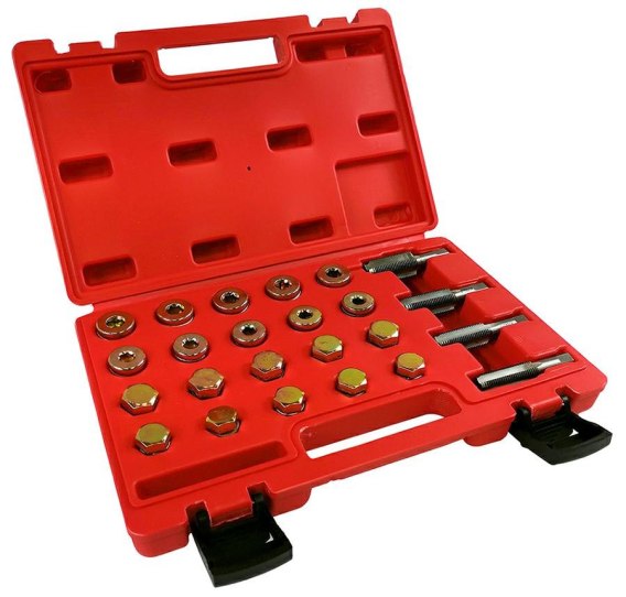 Zestaw do naprawy korków misy olejowej liczący 64 elementy.