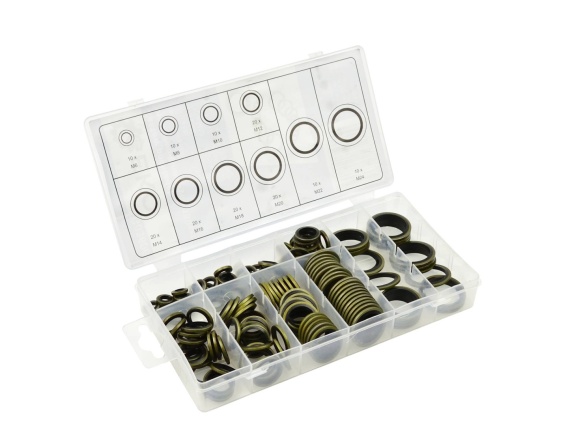 Zestaw podkładek metalowo gumowych w rozmiarach od M6 do M24. Stosowane do uszczelniania połączeń gwintowanych. Wykonane zostały ze stali i gumy NBR. Samocentrujące podkładki zapewniają ścisłe przyleganie gumy do gwintu i doskonałe uszczelnienie połączeń gwintowanych.