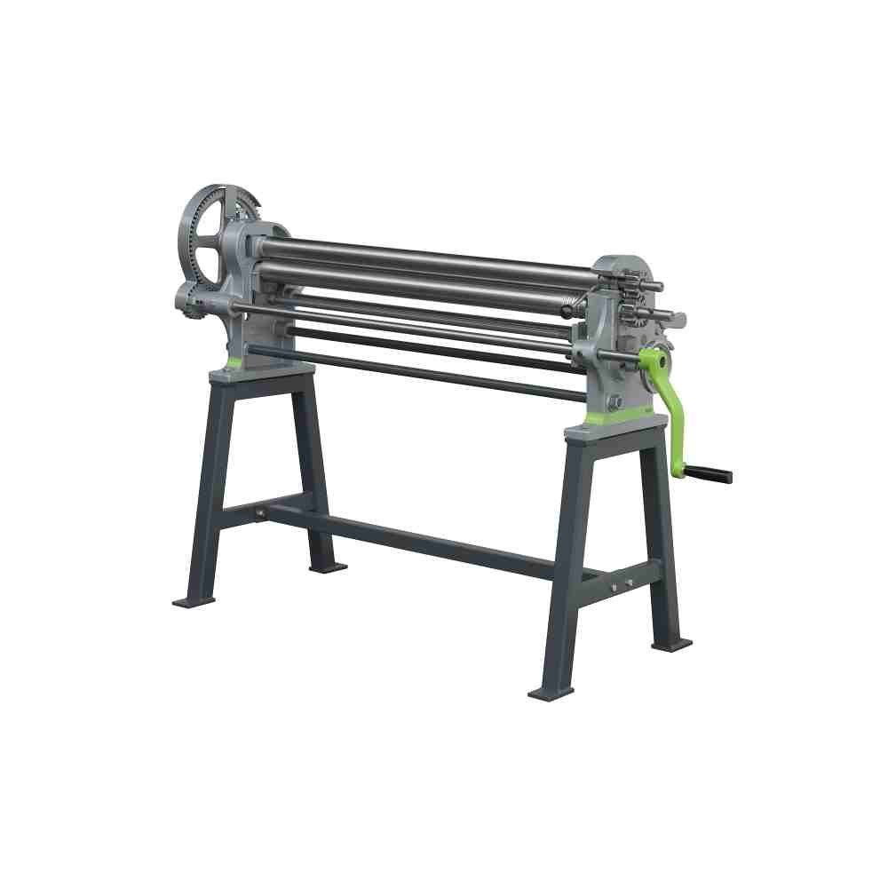 Asymetryczna giętarka walcowa wyposażona w trzy beczkowate walce. Walec górny jest odchylany, aby umożliwić łatwe zdjęcie blachy po jej wygięciu. Walec dolny ustawiany jest za pomocą pokrętła z prawej strony maszyny. Walec tylny ustawia się za pomocą dźwigni i wycinka koła zębatego. Walce można również ustawić ukośnie, do wykonywania gięć stożkowych. Walce dolny i tylny posiadają cztery różne rowki, służące do wwijania wkładek drutowych.Maszyna wyposażona jest w beczkowate walce oraz przekładnię zębatą.UWAGA Podstawa skonstruowana z rur stalowych nie jest załączona, ale można ją kupić jako wyposażenie dodatkowe.