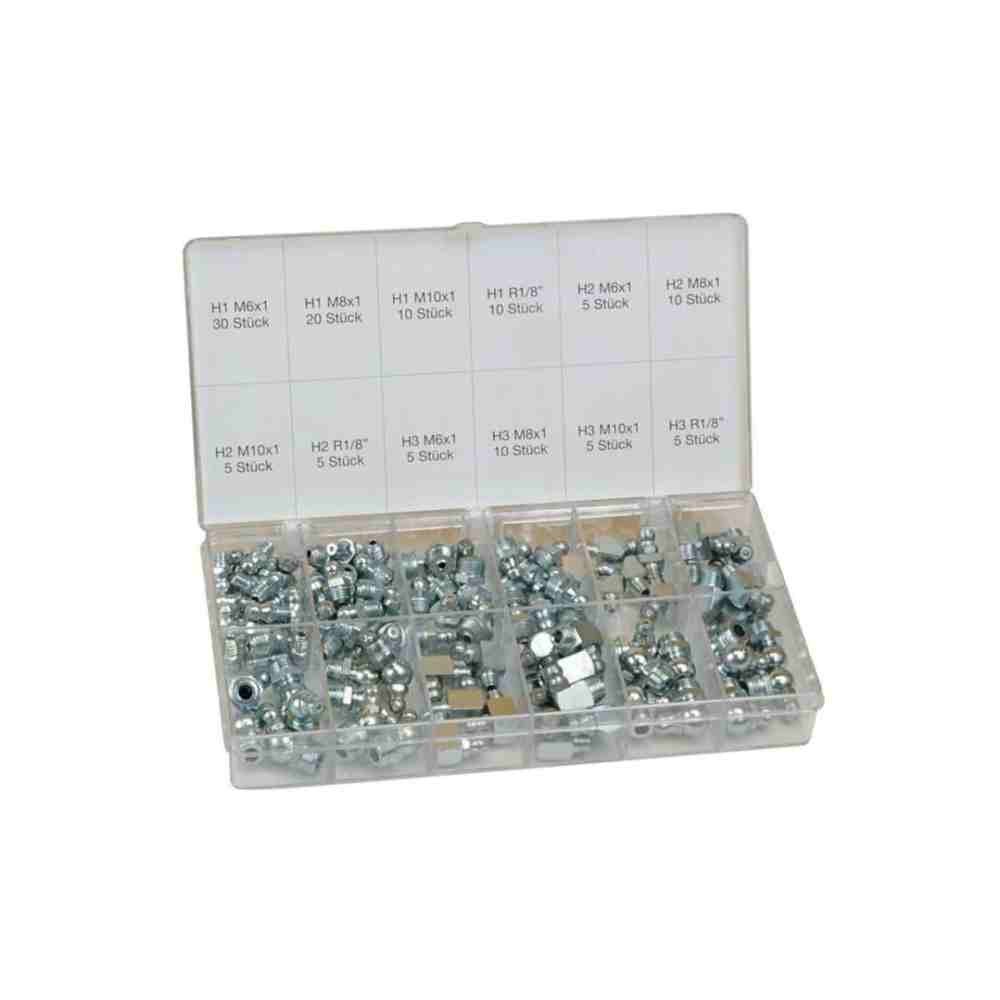 Wybór różnych smarowniczek w pudełku z tworzywa sztucznego.Nr 12990. Wybór smarowniczek, 12 modeli (łącznie 120 szt.). Proste - M6×1, M8×1, M10×1 i 1/8 BSP M6x1 (kwadrat). 45° - M8×1 (kwadrat) M10x1 i 1/8 BSP (kwadrat). 90° - M6×1 (kwadrat), M8×1 (kwadrat), M10x1 i 1/8 BSP (kwadrat). W pudełku z tworzywa sztucznego.Nr 12991. Wybór smarowniczek, 12 modeli (łącznie 230 szt.) Proste - M6×1, M8×1, M10×1 i 1/8 BSP M6x1 (kwadrat). 45° - M8×1 (kwadrat) M10x1 i 1/8 BSP (kwadrat). 90° - M6×1, M8×1 i 1/8 BSP. W pudełku z tworzywa sztucznego.Nr 12992. Wybór smarowniczek, 12 modeli (łącznie 475 szt.) Proste - M6×1, M8×1, M10×1 i 1/8 BSP M6x1 (kwadrat). 45° - M8×1 (kwadrat) M10x1 i 1/8 BSP (kwadrat). 90° - M6×1, M8×1 i 1/8 BSP. W pudełku z tworzywa sztucznego.