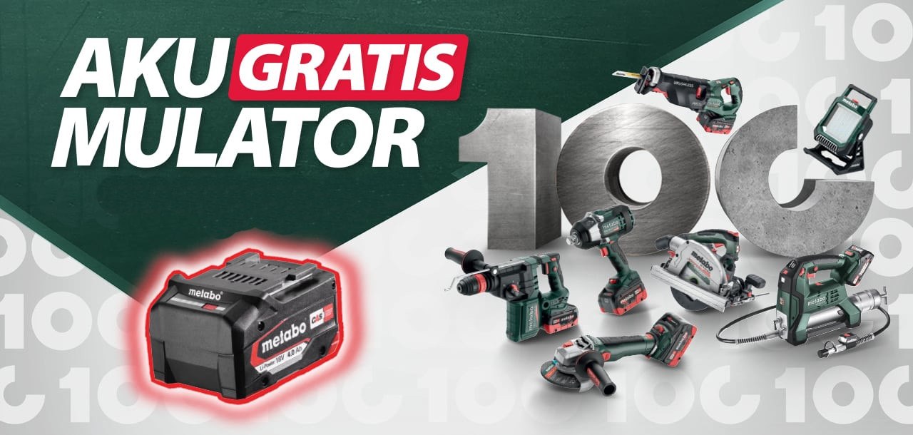 Skorzystaj z naszej wyjątkowej urodzinowej promocji: kup dowolne narzędzie akumulatorowe Metabo 18 V, zarejestruj zakup na stronie internetowej http://www.metabo.com/serviceportal używając kodu "metabo100", a otrzymasz akumulator gratis! Pamiętaj, aby zarejestrować produkt w ciągu 4 tygodni od daty zakupu.