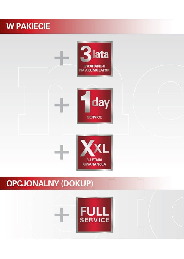 3-letnią bezwzględną gwarancję na akumulatory Li-lon i LiHDPrzedłużoną gwarancję XXL na maszyny po ich zarejestrowaniu w ciągu 30 dni od zakupu